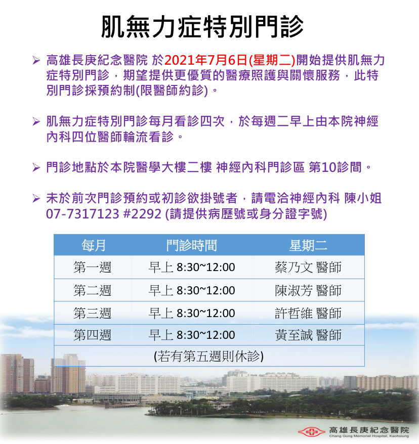 高雄長庚醫院於110年9月起於每週二上午開設『肌無力症特別門診』